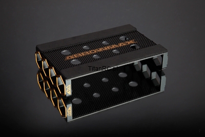 Coming in Arrowmax’ signature black and golden anodising the car stand is made up using honeycomb-design aluminium side frames and a carbon fibre upper deck, made from 2mm material and coming with anti-slip foam strips, the car stand also sports machined holes to take four shock absorbers during building and maintenance.