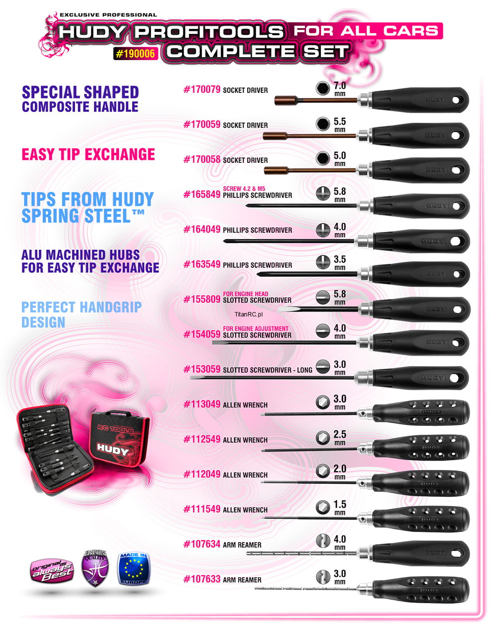 HUDY profiTOOLS Complete Set features 15 most frequently used hand tools for all types and scales of R/C cars, including: Allen wrenches, slotted screwdrivers, Philips screwdrivers, and socket drivers… all nicely packaged in a handy carrying bag. This complete set comes badged with a super low price making it a perfect starting tool set for any hobby enthusiast.