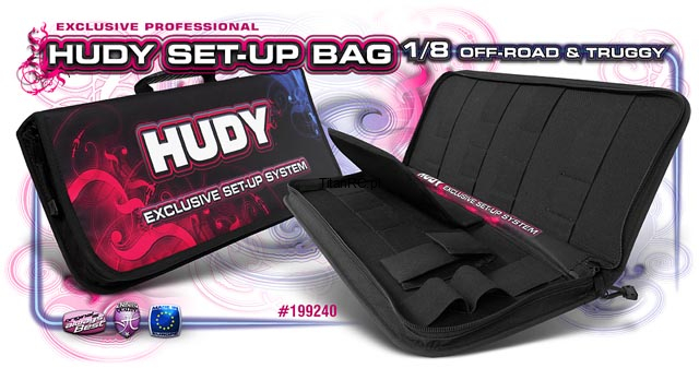 | Inside the bag, there are individual pockets and elasticized bands that can accommodate the following types of components: set-up system, droop blocks & gauges, ride height gauges and more. An separate storage area is given for set-up wheels and camber gauge. Velcro-sealed pocket is for storing fasteners and accessories. The extra long truggy upside measure plate for set-up system fits perfectly into the bag as well. |