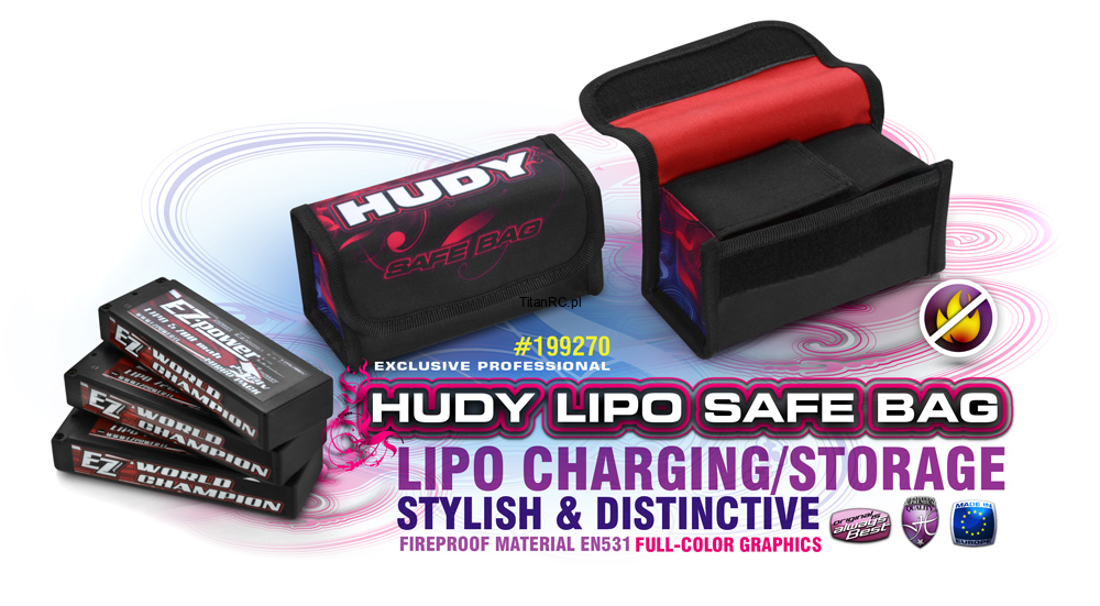 Safety bag for charging and storage of LiPo batteries – a must have for any LiPo battery user. Made from fireproof-certified material conforming to European Union standard EN531. The bag is made from the same fire-resistant material as used in firefighter suits. Super-stylish bag emblazoned with official full-color HUDY graphics. Can store up to 3 standard size batteries.