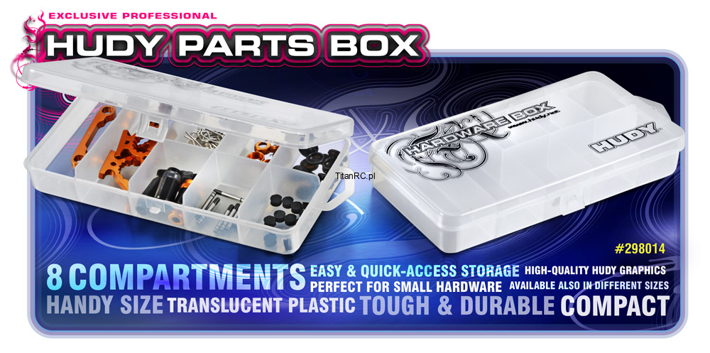 Very handy and useful box for parts storage. Tough, durable, translucent plastic box has 8 compartments. Easy, quick-access storage for small parts. High-quality HUDY graphics. Dimensions: 178 x 94mm. (7.4’’x3.7’’). Long term tested by the team with very high satisfaction rate.