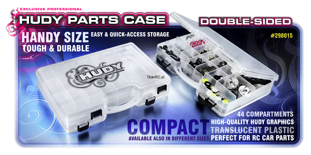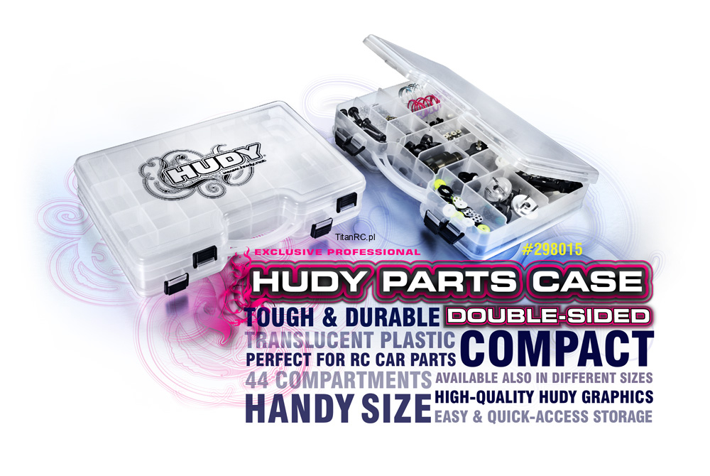 Very handy and useful double-sided plastic case for hardware storage. Tough, durable, translucent plastic case has adjustable internal compartments on each side, and a separate latching cover on each side. Easy, quick-access storage for small parts. Perfectly fits RC car racer carrying bags and storage boxes. High-quality HUDY graphics. Dimensions: 290 x 195mm (11.4’’x7.7’’).