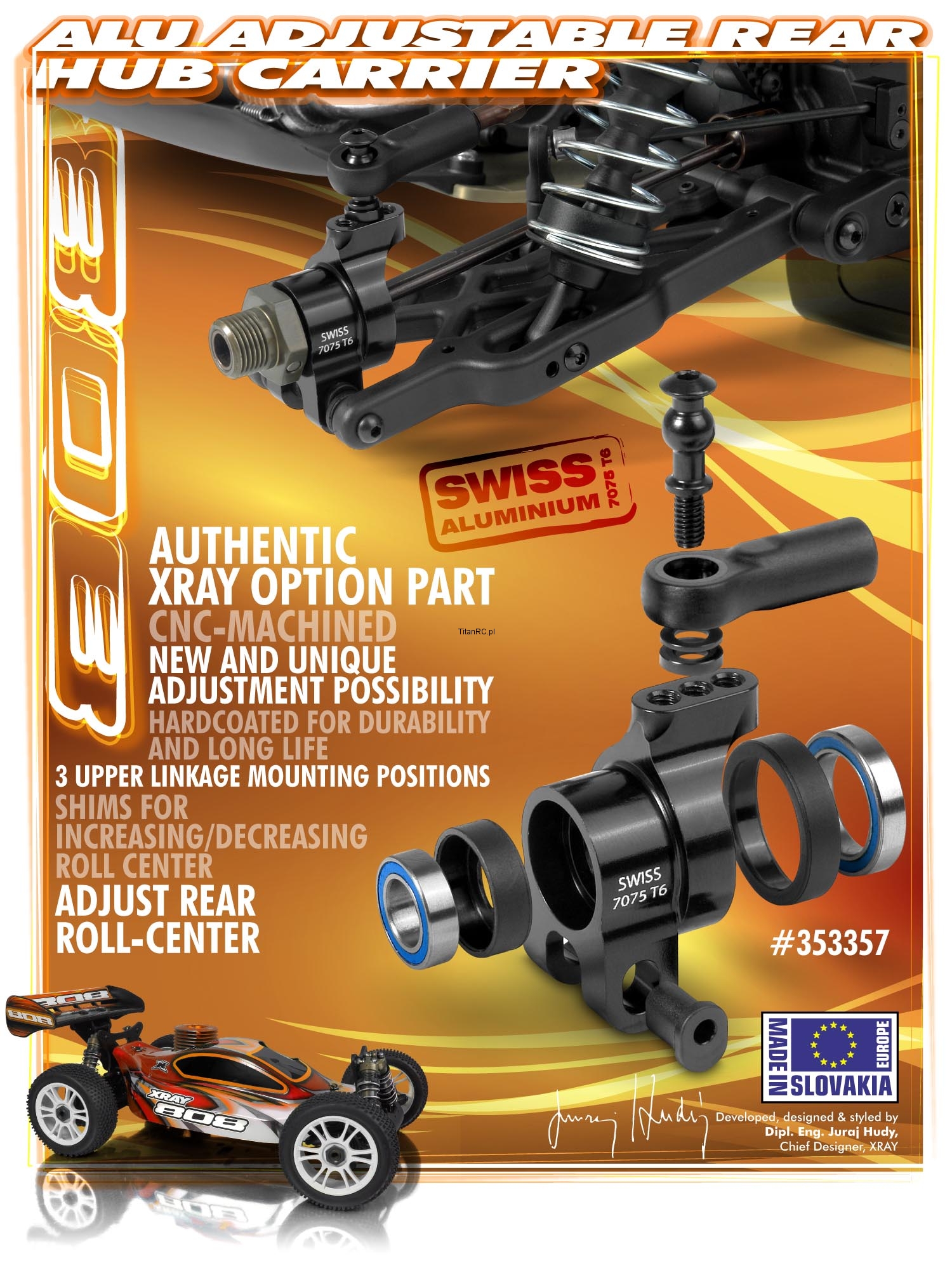 XRAY 353357 XB808 Alu Adjustable Rear Hub Carrier + Ball-Bearings