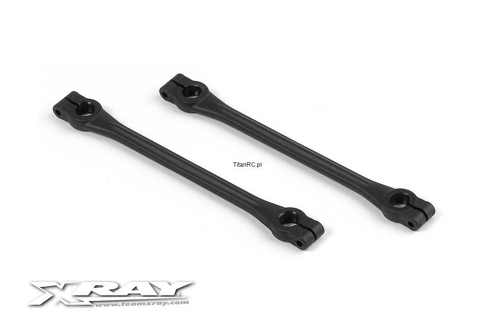 Molded composite pod links for XRAY XII Link rear pod. Equal length links to ensure perfectly-straight pod mounting for straight running. Adjustable ball-joint tension. Specially-formulated tough composite material for light weight, strength, and durability.